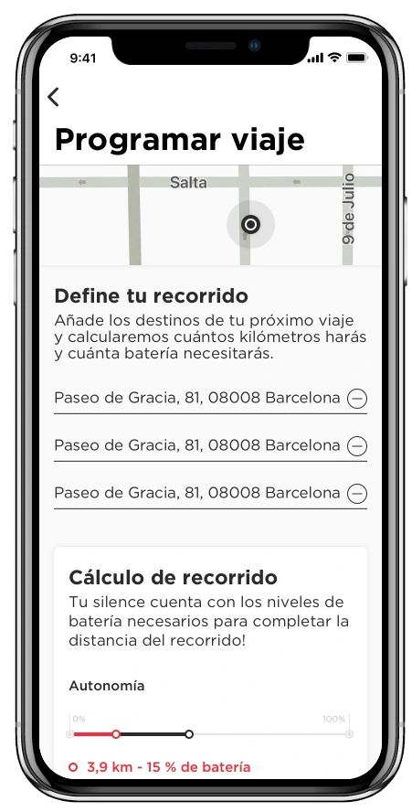 Tout ce que vous devez savoir sur votre véhicule électrique dans l'application My Silence : partage d'amis, partagez votre Silence avec vos amis, contrôlez où il se trouve, vérifiez l'autonomie et l'état de charge de la batterie, créez des itinéraires et activez l'alarme de sécurité. .. Dans la Nanocar S04 vous pouvez en plus pré-climatiser l'intérieur de votre véhicule, accéder sans clé de type "keyless" et vous pouvez ouvrir ou fermer les vitres à distance !