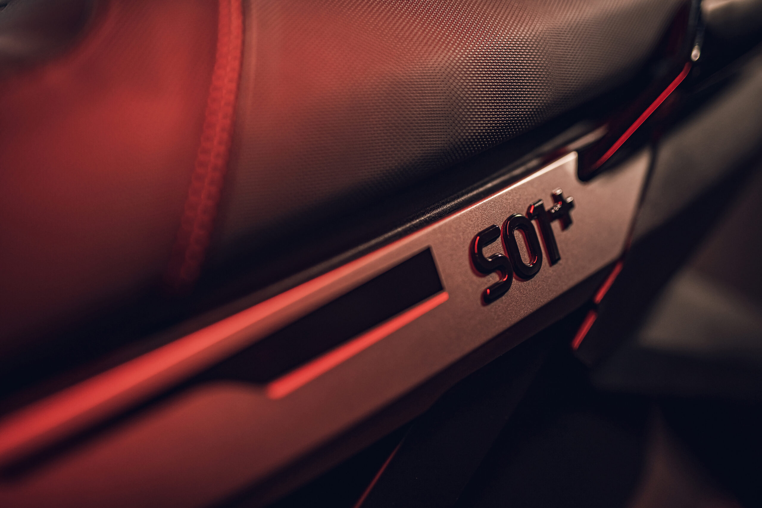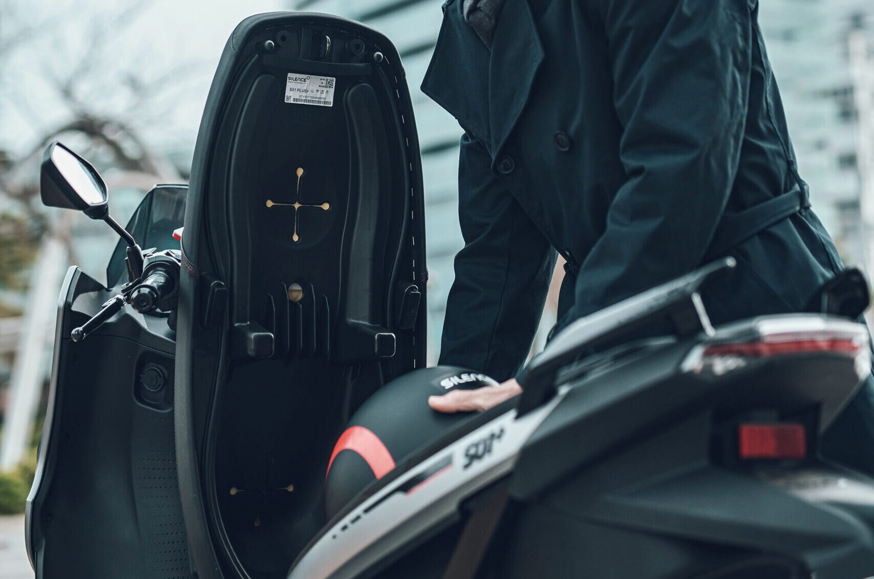 La partie située sous le siège du scooter électrique S01+ est la plus spacieuse de toute la concurrence. Vous pouvez désormais y ranger votre casque et celui de votre passager. Le moteur intégré à la roue et la position de la batterie offrent un gain de place sous le siège et permettent de redéfinir un design pensé pour l’utilisateur.